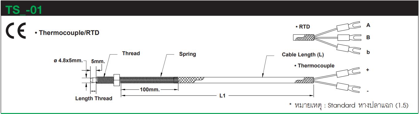 TS_-01 : Temperature Sensor คุณสมบัติ Temperature Sensor • Thermocouple Type K, J, T • RTD Type PT100 • หัวเซ็นเซอร์และเกลียววัสดุทำจากสแตนเลส SUS304 • ติดตั้งแบบกลียว ตัวเกลียวสามารถหมุนได้ • ย่านการวัดอุณหภูมิ : Thermocouple 0-350ํC ขึ้นอยู่กับชนิดของสาย ; RTD Type PT100 -200 ถึง 400ํC ขึ้นอยู่กับชนิดสาย Class A, Class B สอบถามเพิ่มเติม Tel. : 02-693-7005 Hotline : 090-197-9601 Line ID : @primusthai E-mail : sales@primus.co.th www.primus.co.th www.pm.co.th (Shop Online) www.themtech.co.th